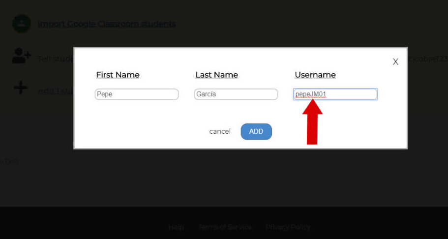Al pulsa en la opción "Add 1 student" nos aparecerá una ventana con tres campos que tendremos que rellenar. Pondremos el nombre del alumnos, primer apellido y nombre de usuario. Este último debe ser un nombre que nadie haya registrado antes en Storyjumper por lo que conviene añadir al nombre elegido unos números, iniciales... que lo haga único porque si no, nos dirá que no podemos usar ese nombre de usuario. Pulsaremos en el botón "ADD" para añadir ese alumno a la clase.