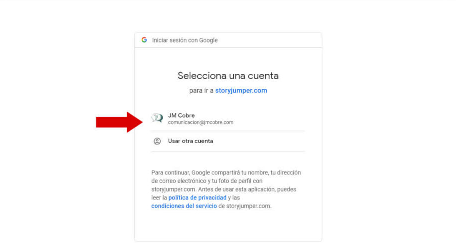 La cuenta de Google o de la red social utilizada pedirá permiso para que Storyjumper pueda acceder utilizando cierta información. Seleccionar dicha cuenta y pulsar en el botón "PERMITIR"