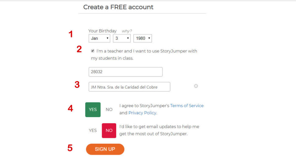 Ahora estaremos en una página donde nos pediran datos personales. De acuerdo a la numeración de la imagen primero nos piden fecha de nacimiento para confirmar que somos mayores de 13 años, ya que los menores acceden a esta web o con el permiso explicito de sus padres o a través de una cuenta creada por el profesor como miembro de una clase virtual. A continuación marcar "I´m a teacher..." para indicar que somos profesores y que aparezcan el resto de campos de la imagen. Rellenar nombre del centro, aceptar los términos de uso de esta aplicación web, decidir si se quiere o no recibir correos y pulsar en el botón "SIGN UP"