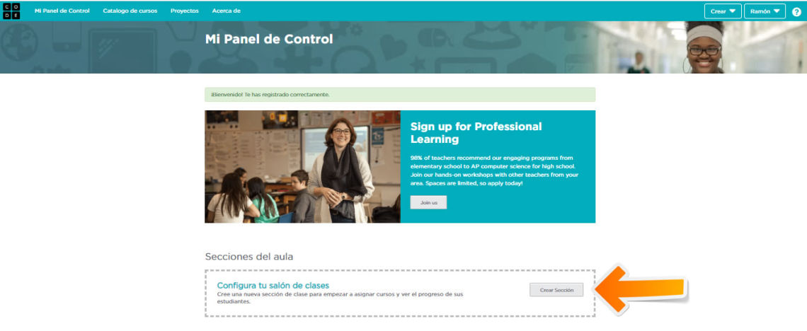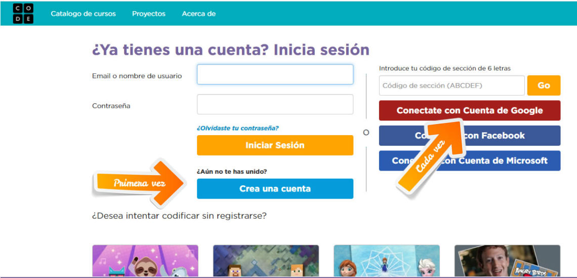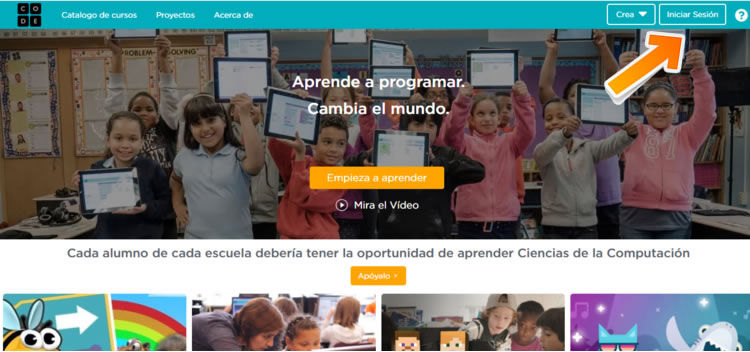 Tras acceder a la dirección web de CODE hay que registrarse por primera vez. Para ello se pulsa en el botón "Iniciar Sesión" situado en la esquina superior derecha. Si la página aparece en inglés y quieres ponerla en español puedes hacerlo en el desplegable de idiomas que encontrarás en la parte inferior izquierda de la página. Puedes acceder a la web de CODE pulsando en el botón.