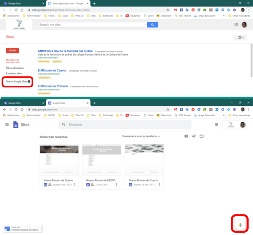 Esta aplicación tiene un modo clásico y una versión nueva más actualizada. Este tutorial está realizado para aprender a trabajar con la versión nueva. Cuando entremos nos ofrecerá el aspecto de la versión clásica, que es el que se ve en la parte superior de la imagen. Si pulsamos en "Nuevo Google Sites" que se muestra rodeado de color rojo en la imagen el aspecto de la pantalla cambiará al de la nueva versión y no tendremos más que pulsar en el botón con el signo + que se encuentra en la parte inferior para crear una nueva web.