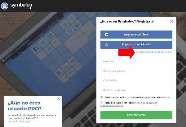 Una manera de registrarse es rellenando los campos que aparecen, aunque es más sencillo con un perfil de una red social. Si estás navegando con Chrome y te has identificado con tu cuenta de Google, la opción más sencilla es registrase con dicha cuenta . Para ello, pulsar sobre el texto señalado en la imagen "Mostrar más opciones para entrar".