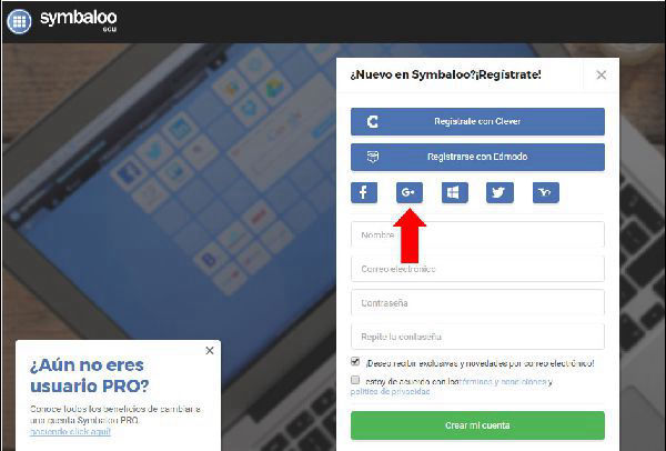 En la nueva pantalla que aparece, pulsamos sobre el icono de Google indicado. Registrarse de esta manera evita tener que recordar usuario y contraseña específico para Symbaloo y facilita el acceso para futuras ocasiones. También hay otras formas de registrarse con otros perfiles de redes sociales.