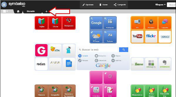 Ahora estaremos en la página de inicio de Symbaloo EDU. Ahora vamos a crear un nuevo webmix (pantalla personalizada). En la parte superior, como se indica en la imagen, hay un signo +. Pulsar sobre él para crear un nuevo webmix.