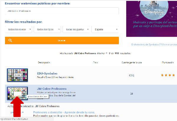 Tras la busqueda veremos varios webmixes. El que queríamos encontrar aparecerá en la pantalla. Pulsaremos sobre la miniatura del webmix como se indica en la imagen.