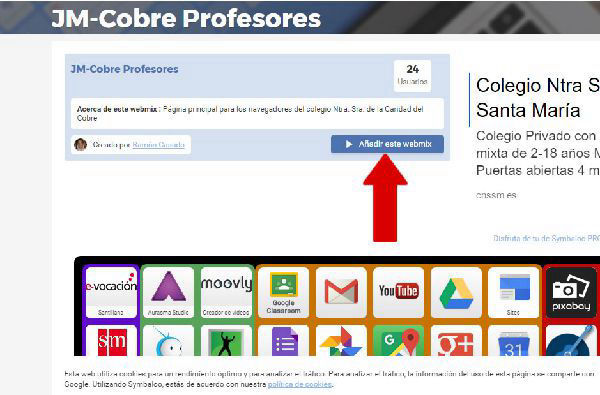 En la siguiente pantalla, pulsar en el botón indicado "Añadir este webmix". De esta manera habremos incorporado el webmix a nuestra página de Symbaloo. Será una nueva pestaña que podemos tener como la pestaña de inicio por defecto.